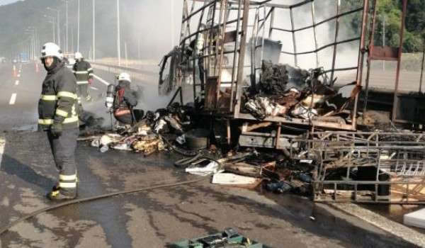 Anadolu Otoyolu Kaynaşlı geçişinde İstanbul'dan aldığı ev eşyasını Ankara'ya götüren Hüseyin Ö. idaresinde 34 YNZ 94 plakalı nakliye kamyonunda yangın çıktı. Sürücü aracı emniyet şeridine çekip yangın tüpü ile ilk müdahalede bulundu. İhbar üzerine Kaynaşlı Belediyesi İtfaiye Müdürlüğü ekipleri alev topuna dönen kamyonu yarım saatlik çalışmanın ardından söndürdü. Kısmen kapanan Anadolu Otoyolu Ankara istikameti yangının söndürülmesi ile yeniden trafik akışına açıldı.