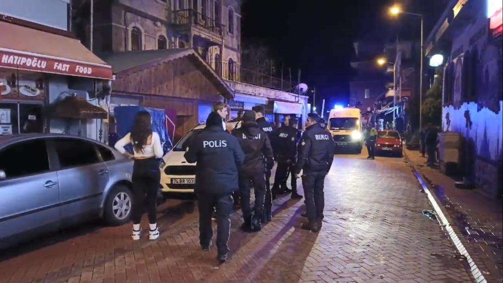 Edinilen bilgiye göre, Amasra ilçe merkezinde alkollü balık restoranında yemek yiyen 2 grup arasında kavga çıktı. Erkek şahıslardan birinin diğer grupta bulunan kadına baktığı iddiasıyla çıkan kavgada, şişe ve bıçak kullanıldı. Kavgaya karışanların biri bıçak darbesi ile gözünden, diğeri ise şişe darbesi ile kafasından yaralandı.