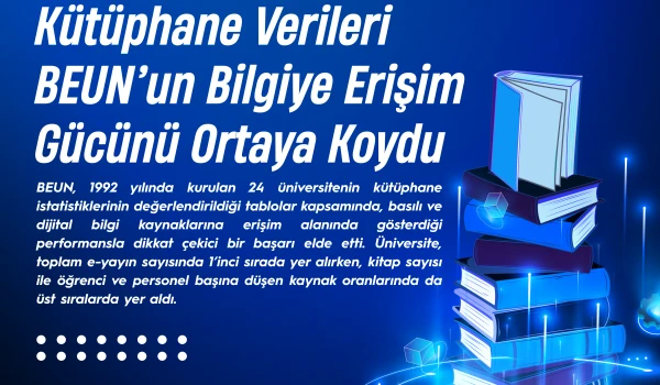 Dijital kütüphane olanaklarıyla öne çıkan BEUN, 11.861.304 e-yayın ile toplam e-yayın sayısında 1’inci sırada yer aldı. Üniversite ayrıca, öğrenci başına düşen e-yayın sayısında 2’nci, akademik personel başına düşen e-yayın sayısında 3’üncü ve personel başına düşen e-yayın sayısında 6’ncı sırada yer alarak dijital bilgi kaynaklarına erişim kapasitesini güçlü bir şekilde ortaya koydu.